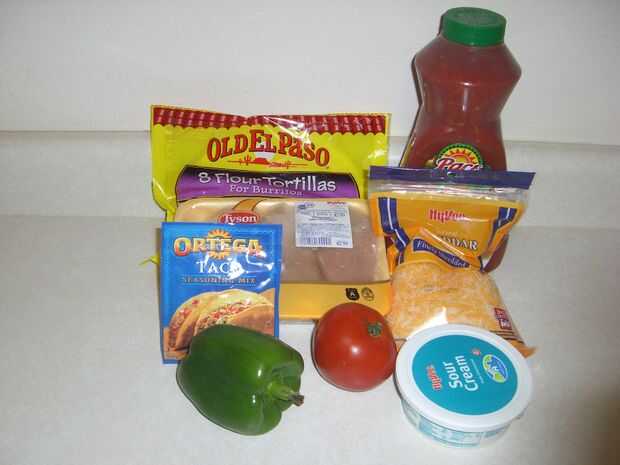· 8 – harina Tortillas · 4 – descongelar pollo mama · Queso Cheddar rallado 3 tazas de queso · Taco 1 sobrecito sazonador · 1 tomate · 1 verde pimiento · Amargo crema · Salsa fuentes: