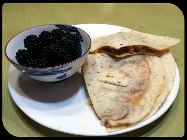 Siempre estoy buscando maneras creativas de utilizar las sobras. Mientras mirando el surtido de diversas cosas en el refrigerador, VI perros de Chile y la inspiración pulsó, y este es el resultado. Había programado yo mismo, y esto tomó literalmente 5 minutos desde el momento que empecé a sacar cosas y ponerlas en el mostrador al tiempo que la quesadilla terminada salió el microondas.