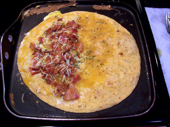 Una vez que ha separado la mezcla uniformemente a través de una mitad de la superficie de la tortilla, añadir otro puñado de queso encima de la parte de la mezcla de huevo. Esto ayudará a estabilizar la mezcla por engrosamiento y enredo el huevo más. Esto también nos ayuda a pegarse al otro lado de la tortilla a la mezcla una vez que doble la otra mitad de la tortilla. Deje que la mezcla se sienta durante un minuto o dos para ayudar a derretir el queso y huevo juntos y permitir que el huevo a cocinar y un poco empezar a solidificar.