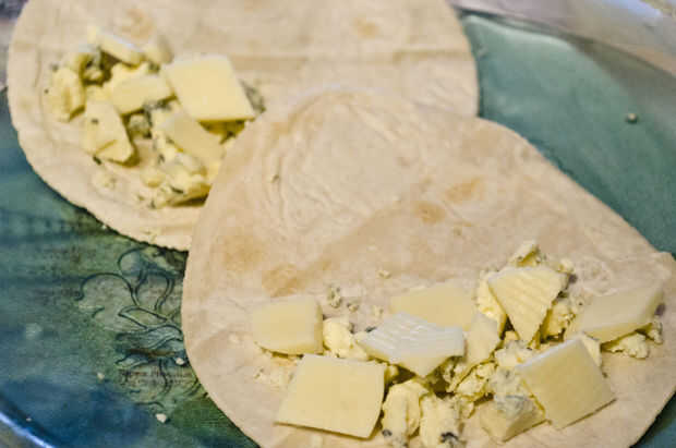 Luego corte el queso en pequeños trozos para que se funden rápidamente. Una vez que tengas todo eso hecho, basta con poner el queso en las tortillas como se muestra y dobla las tortillas una vez más.
