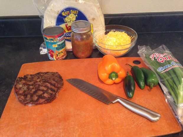 Con cualquier cosa que usted desea o puede hacer. Quesadillas son grandes que usted puede utilizar una variedad de ingredientes sobrantes. En este caso utilicé: restos de ternera, pimiento naranja, cebolla verde, jalapeño, salsa casera, queso rallado y por supuesto tortillas. Frijoles refritos se muestran aquí, pero terminé no usarlos. Te recomiendo una mezcla de quesos. Si sólo utiliza un tipo, te recomiendo que algunas de mármol Monterrey Jack (amarillo y blanco). Puede comprarlo rallado o hágalo usted mismo. Use su imaginación! Incluso podría hacer desayuno Quesadillas con la simple adición de huevos revueltos.