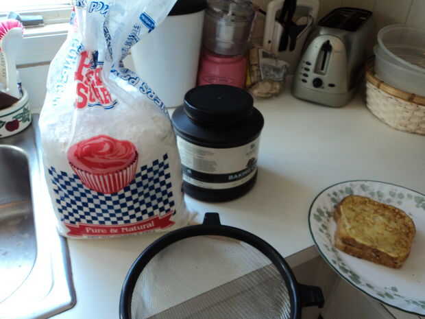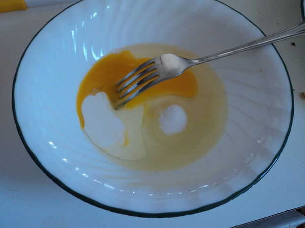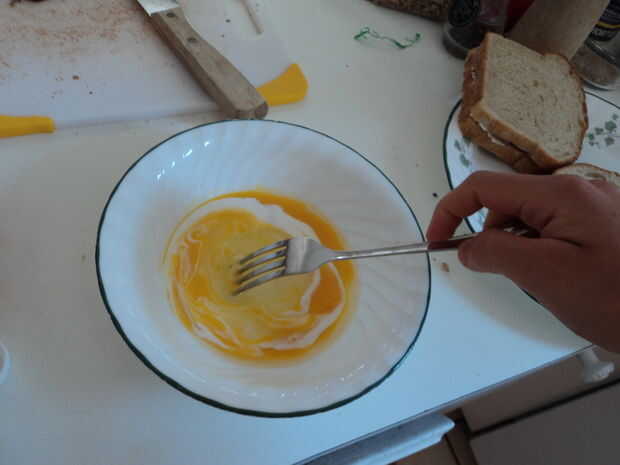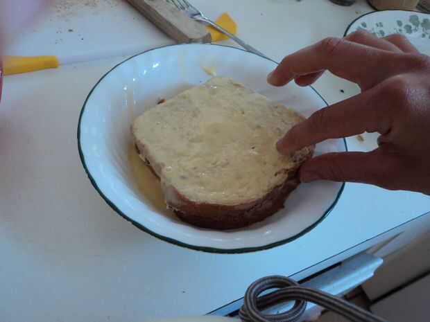 Ahora mezcla un huevo, unas cucharaditas de azúcary alguna crema (~1.5 cucharadas) en un recipiente lo suficientemente ancho como para el pan. Inmersión de ambos lados del sandwich en la mezcla, asegurándose de que empapa para arriba y limpiar extra. Probablemente habrá suficiente mezcla de huevo para hacer dos sándwiches, dependiendo de su tamaño.