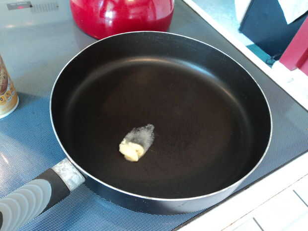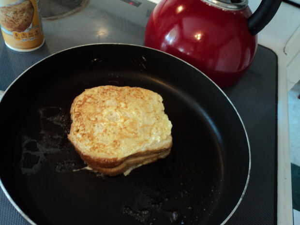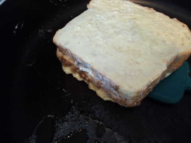 Derretir la manteca en una sartén medio o medio-alto y freír el sándwich como tostadas por ambos lados, hasta que el huevo es cocido y ligeramente dorado.