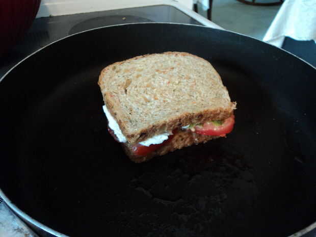 Se puede cocinar este sándwich en una prensa o en una parrilla, pero opté por usar una sartén y aceite de oliva. Presionado lo de vez en cuando a todo se funden juntos. Si tratas de la parrilla o prensa, sugeriría cepillado un poco de aceite en el exterior del pan para asegurarse de que lo Mojo bien y no se pega. Delicioso!