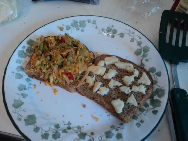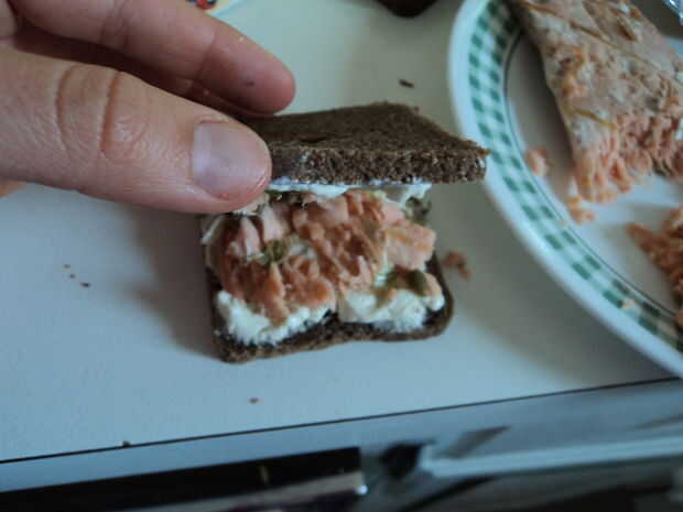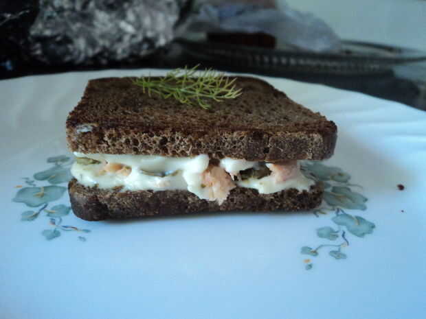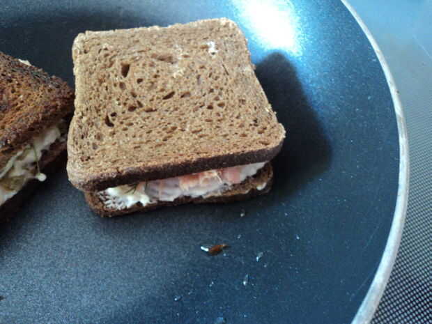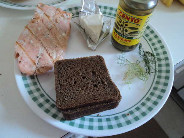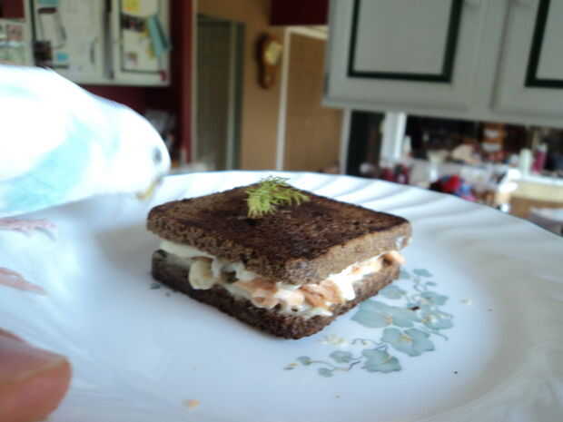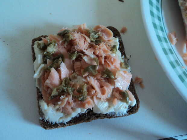 Saltear en una generosa cantidad de semilla de uva o de otro aceite de sabor de luz; el pan seco de centeno más que pensé sería absorvido. Mi salmón era a la brasa - usando salmón real ahumado sería definitivamente amp el sabor, pero el resultado fue todavía maravilloso. Queso crema, salmón y los sabores picantes de las alcaparras y el eneldo. Incluso mi mascota Perico no podía mantenerse lejos de ella!