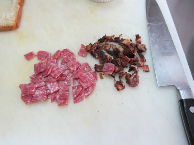 Mientras las papas se cocción, picado salami y tocino añadir al sandwich. Prefiero picarlos lo contrario que un pedazo entero de salchichón o tocino puede conseguir rasgado hacia fuera en un bocado. También completé el siguiente paso, mientras que las patatas eran crujientes.