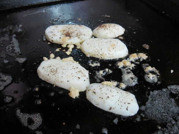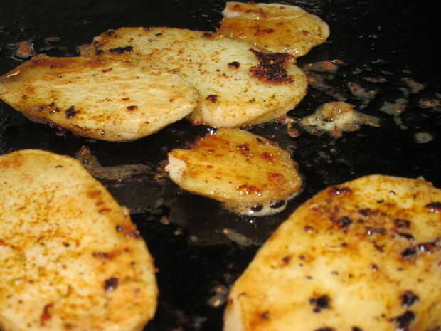 Las patatas han sido precocidas así esto es sólo para conseguir que fuera crujiente que hace patatas fritas tan rematadamente sabrosa. Calentar la mantequilla en la superficie de cocción. Cuando se haya derretido y caliente, añadir tus rodajas de patata. Mina había sazonado con sal y pimienta en el primero, y después añadido especias cajún. También lanzó en algunos ajos picados y había añadido un poco más mantequilla cuando sea necesario.