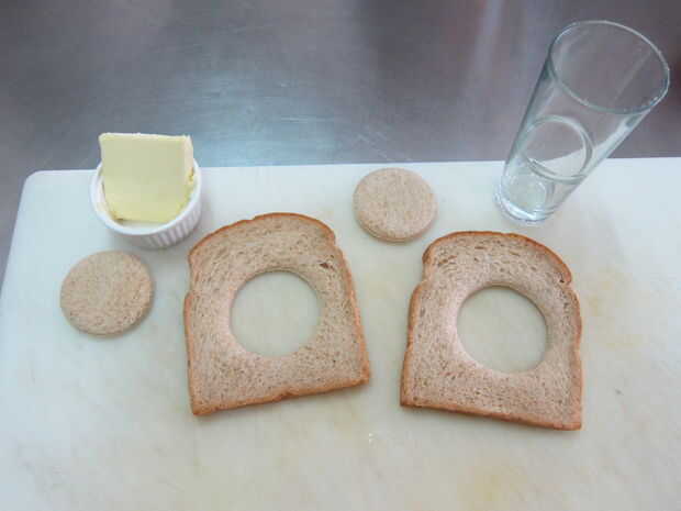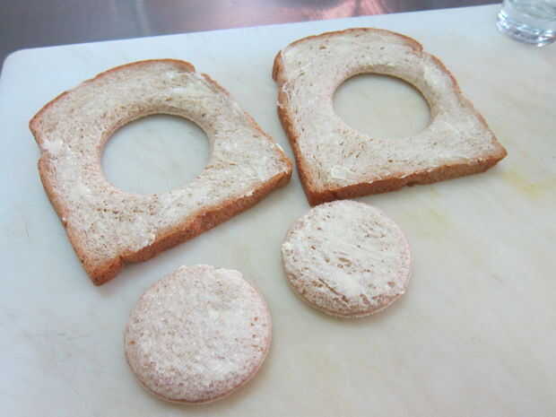 Dependiendo de la herramienta de corte elegido, puede ya sea mantequilla el pan y luego cortar el agujero, o cortar el agujero y luego mantequilla el pan. Luego corte la mantequilla es más rápido pero un poco más complicados. Corte y mortero luego le ahorra de mantequilla fuera de la Copa de lavado.