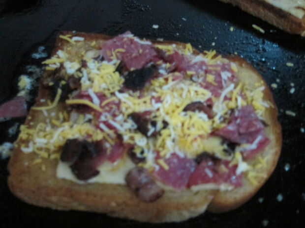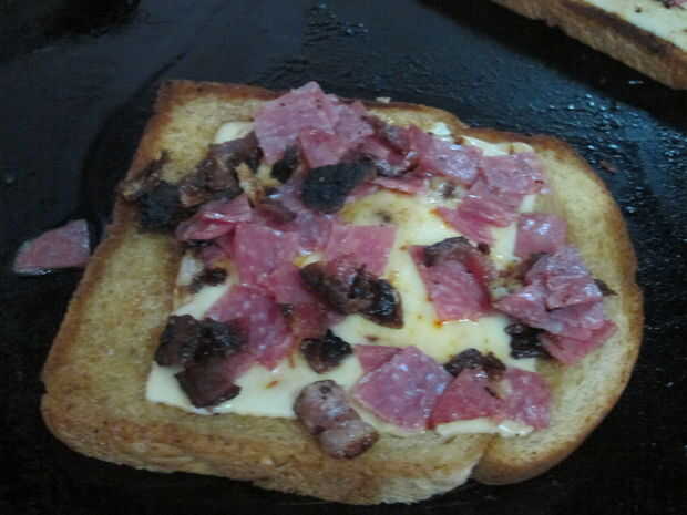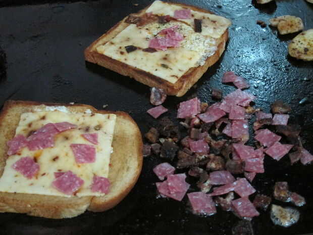 Una vez han volteado cada pedazo de pan, coloque el queso encima, agregar las carnes y opcionalmente más queso. Calienta mi salami y tocino antes de colocar el bocadillo. El calor añadido ayuda a derretir el queso un poco y evita el sobrecalentamiento del huevo.
