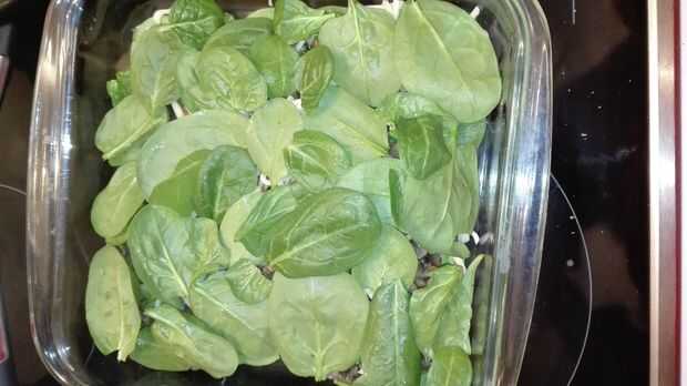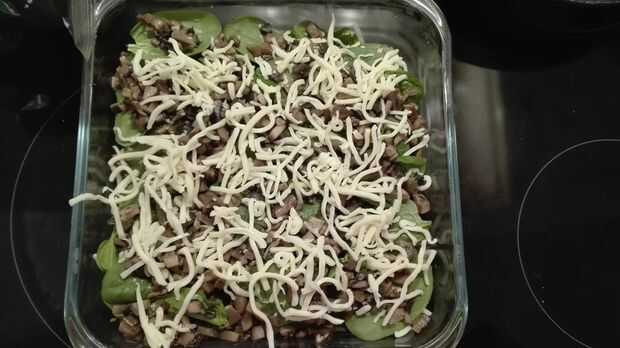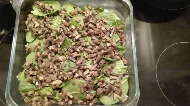 En primer lugar, deja una capa de espinacas. En segundo lugar, una capa de las setas salteadas en rodajas o picaditas. En tercer lugar, una capa de queso rallado. Repita otra vez las tres capas en el mismo orden.