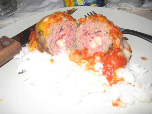 albóndigas de pavo con una sorpresa dentro.Paso 1: Carne de temporada Combinar lo siguiente:Ingredientespavo molido de 2 librasc 1/2 pan rallado (seco los enlatados)2 huevosunos dientes de ajo rallado (al gusto; Utilicé unos 8 dientes grandes)1 cucha