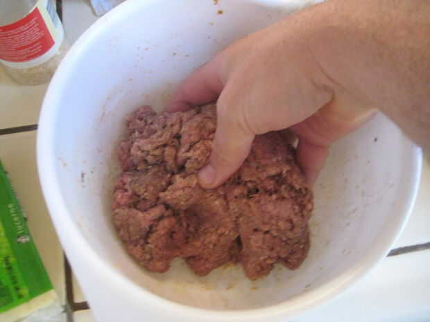 1. Coloque la carne de la hamburguesa en un tazón grande o un hueco por el centro de la cacerola. 2. Coloque la salsa Worcestershire, barbacoa salsa, pimienta negra, ajo, cebolla en polvo y sal en área hueca de hamburguesa. 3. Mezcle con las manos (limpias) hasta que todo se mezcla bien.