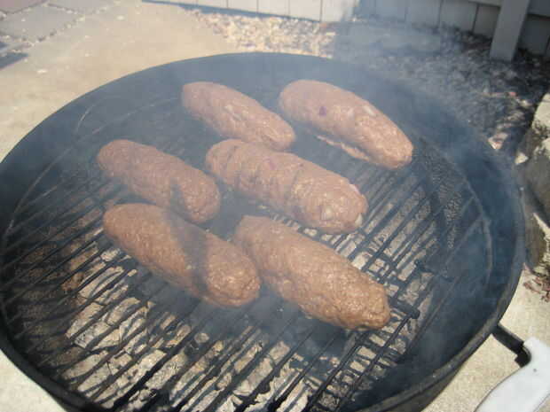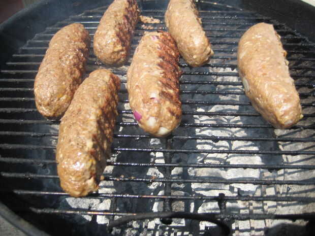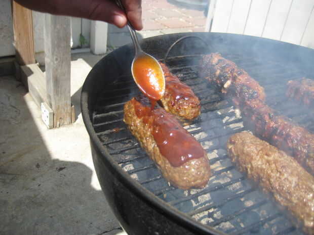 3. una vez ya cocidos los "lados" 4, Hilvanar la parte superior de los perros con salsa BBQ, entonces inmediatamente vuelta perro e hilvanar el otro lado.