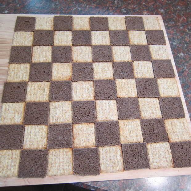 Comience con la primera fila y lugar cada otros uno, pan, galleta, pan, galletas, etc.. La siguiente fila entonces comenzaría con galletas, pan, galleta, pan, etc.. Haciendo el clásico patrón de checker board. Continuar hasta tener un cuadrado de 8 por 8.