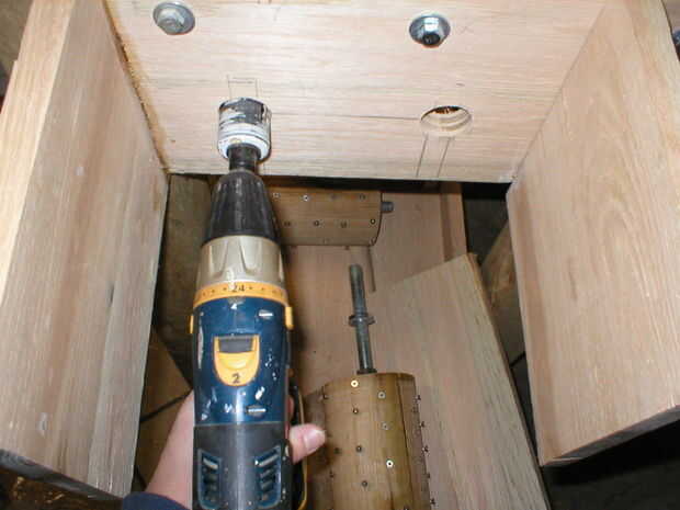 Poner una varilla roscada de 3/4" a través de los rodillos y perforó un par de agujeros en el lado de la caja para que se sientan en. En el interior he utilizado un par de rodamientos en prensa que me ha pasado tener a mano. Los rodamientos de prensa permiten que el eje gire sin destrozando la madera.