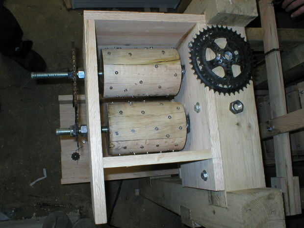Tuve que crear un mecanismo de manivela para trabajar los rodillos, usé un par de piñones de bicicleta soldada a algunos grandes tuercas por un amigo. Entonces puse en el eje que se rosca a través de los rodillos y apretar las tuercas rápidas.