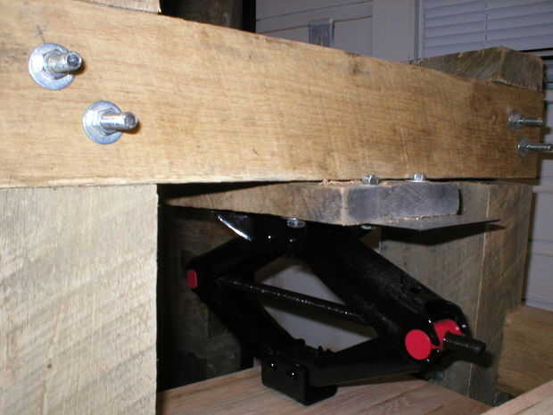 Monta al gato de tijera boca abajo en el lado opuesto de la caja de puré. I taladrar cuatro orificios en la placa inferior del gato y había montado en un tablero de 1 x 4 que estaba sobre un pie de largo. Entonces montara junta a la transversal con pernos.