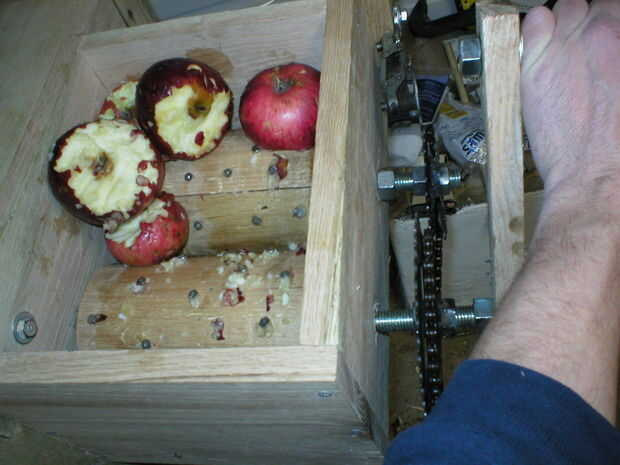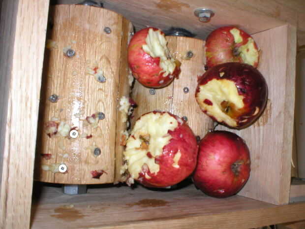 Cuando alimenté las manzanas en la caja de puré, quería rebotar en los rodillos al principio, pero luego comenzó a moler para arriba. Creo que si tuviera una tolva, el peso de las otras manzanas ayudaría a empujar a través. También, necesito los rodillos reorientó, pero es alentador ver masticar las manzanas un poco.