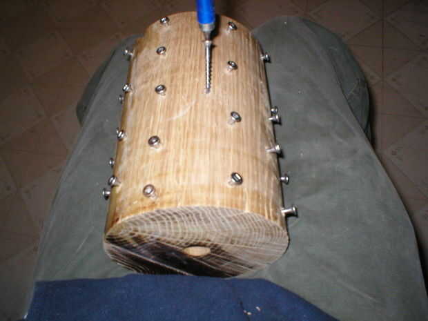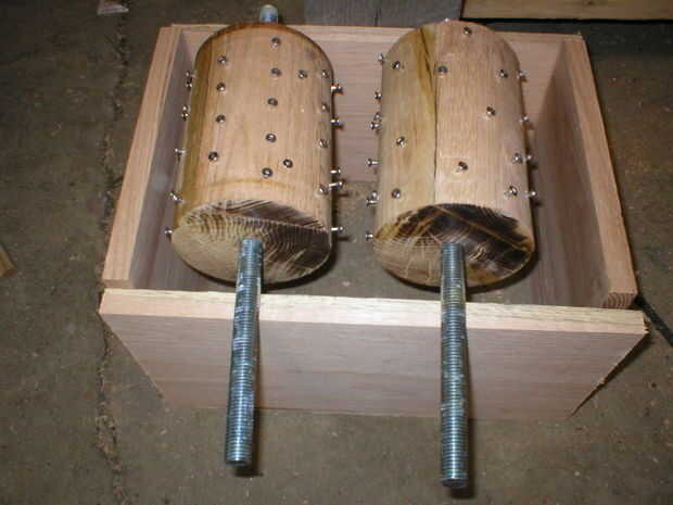 Los rodillos ellos mismos no van a triturar las manzanas, así que tuve que darles un poder penetrante. Atornillan tornillos inoxidable todo los rodillos, dejando las cabezas que sobresalen 1/8 a 1/4" o algo así. Leo una cuenta online de un chico que se había hecho una similar configuración de rodillos, y su experiencia fue el menos dejó las cabezas sobresalen el fino suelo las manzanas.