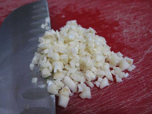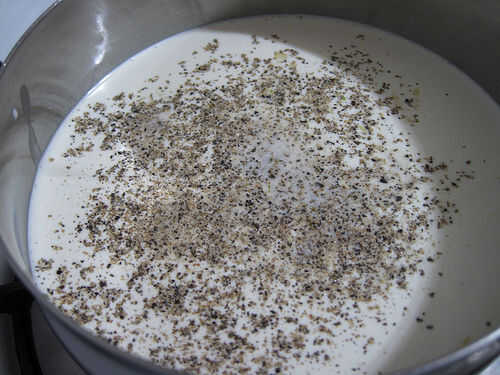 Ahora, picar los dientes de ajo y poner el ajo y la crema en la cacerola a fuego bajo. Agregue sal y pimienta y revuelva. Revuelva la crema cada vez y un rato durante el resto del trabajo de preparación.
