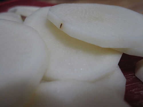 Tenga en cuenta que las patatas deben ser muy delgadas, alrededor de 1/8 de pulgada.