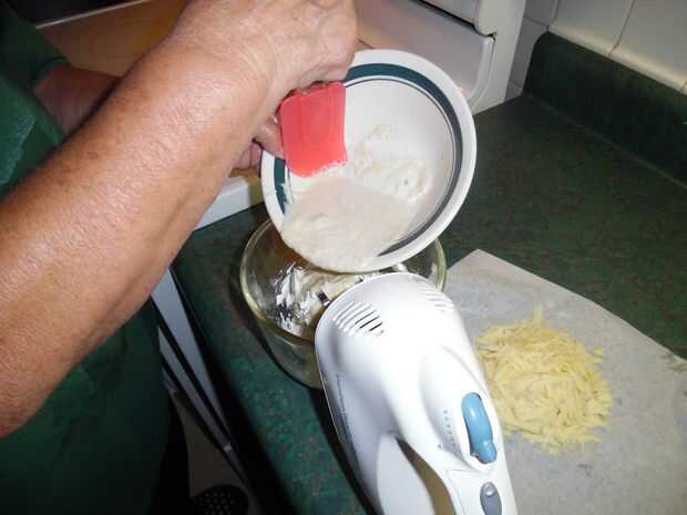 Combinar el chedder rallado y el queso crema. Usando la batidora, se mezclan los quesos. Añadir los ingredientes restantes, excepto las galletas y mezclar bien.