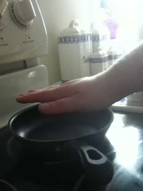 PRECAUCIÓN: al hacer este paso, tenga cuidado de no acercar su mano también al pan, pero conseguir cierre bastante que usted puede decir si la sartén está suficientemente caliente o no.