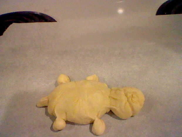 2 rodillo la otra mitad en una serpiente y córtelo en trozos de 5. 4 piezas serán los miembros de los otros puntos y se convierte en la cola.