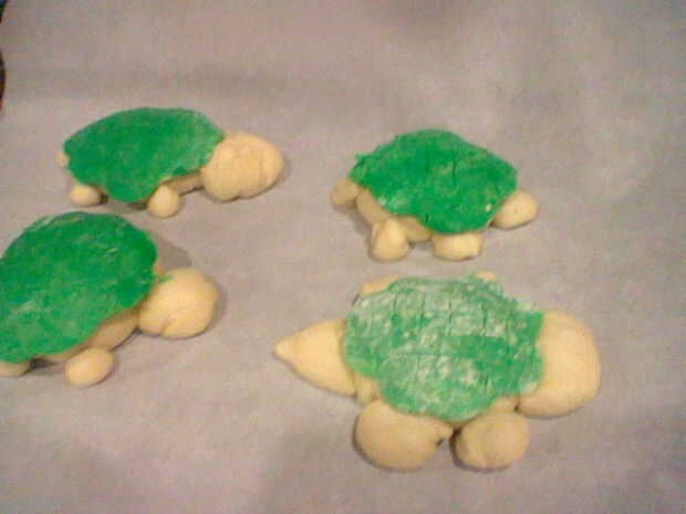 1. tomar la cookie de la refrigeración y recórtalo en rodillo de diez piezas con un alfiler o sólo la calabaza con el puño. para que sea plana para montar sobre el cuerpo de las tortugas.