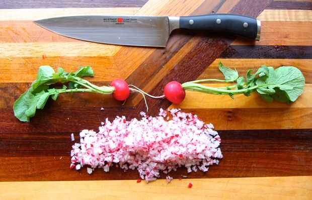 Picar y picar los rábanos hasta que son iguales en tamaño y forma a sus zanahorias y brócoli.