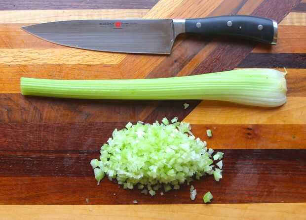 Cortar ambos extremos de sus tallos de apio. Picar el apio hasta que es igual en tamaño y forma a sus tres primeros vegetales.