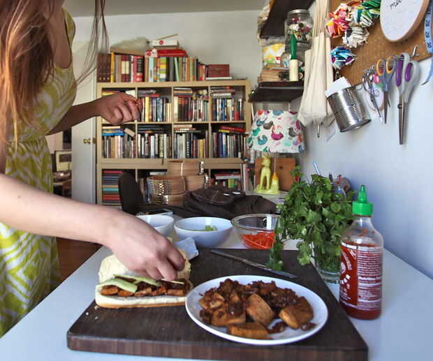Separarse ambas mitades del pan con mantequilla o mayo - añadir sriracha un poco de eso. Poner en una buena cantidad de tofu y cebolla y luego cubra con las zanahorias en escabeche y otras verduras. Superior con cilantro y comer!