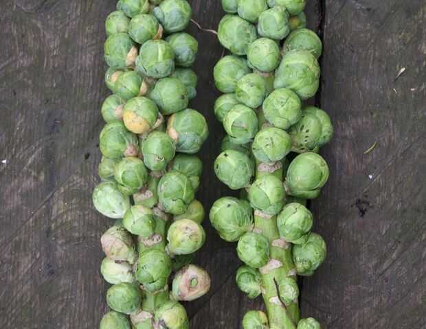 • Recién cosechadas Inicio cultivado coles de Bruselas (o a la izquierda sobre brotes)