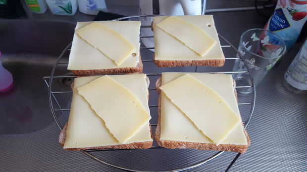 Tomar una rebanada de queso, asegúrese de que el queso no va sobre el borde de su pan, o se escurran.