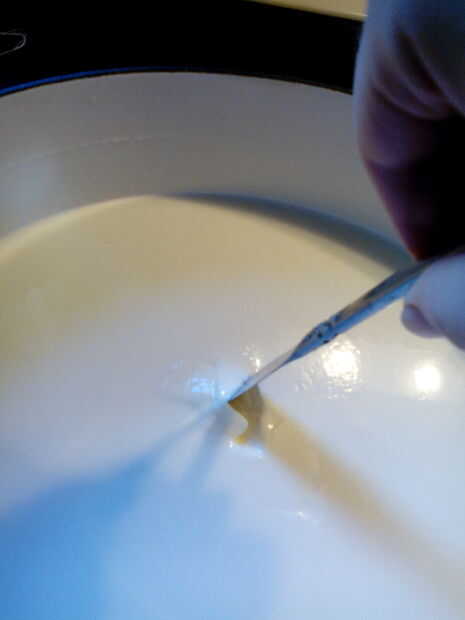 Después de 30 minutos a 2 horas, el queso debe ser en la etapa de ruptura. Más gruesa que la natilla, pero no tan espesa como gelatina. De puso un cuchillo en el y tirar para arriba, nada se pega al cuchillo y la navaja crea una ruptura en la cuajada (mirar la foto).