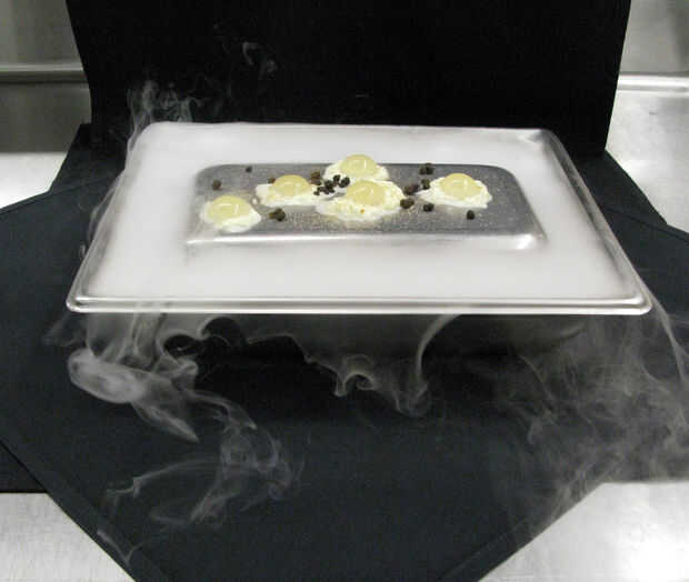 Mi inspiración para el diseño de placas tomó una gran cantidad de pensamiento. Después de leer sobre este concurso de recetas, me pregunté "¿Qué es molecular gastronomía supone que debe para ser todo sobre?" Llegué a muchas conclusiones... que obvio es que una presentación humo siempre parece fresca. Pero luego pensé en cómo muchas de estas técnicas se utilizan para hacer un tipo de plato como algo más. Así que decidí hacer mi plato parezca un huevo porque siento que el huevo es uno de los ingredientes más importantes solo en todas las artes culinarias. Mi plato utiliza la espuma de queso de gruyère como el "huevo", la cúpula de agar Riesling como la "yema" y las alcaparras tocino frito como granos de pimienta negras y todavía hay saborizantes de huevo previsto en mi plato. Nuevas texturas, nuevas temperaturas, nuevos colores, nueva de la combinación de sabor y el siempre presente desafío de crear una sensación de familiaridad y equilibrar una sensación del comensal siendo parte de algo especial. Este plato es mi mejor intento de lograr ese equilibrio y lo que siento molecular gastronomía se supone que representan.