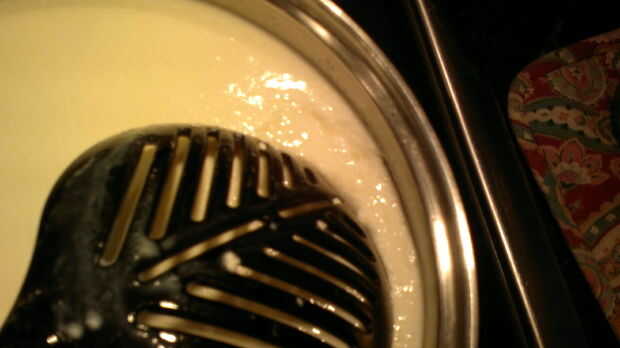 Usted sabrá que la cuajada está lista cuando la leche es grueso yogur y se puede tirar cerca de 1/2 pulgada lejos del borde de la cacerola.
