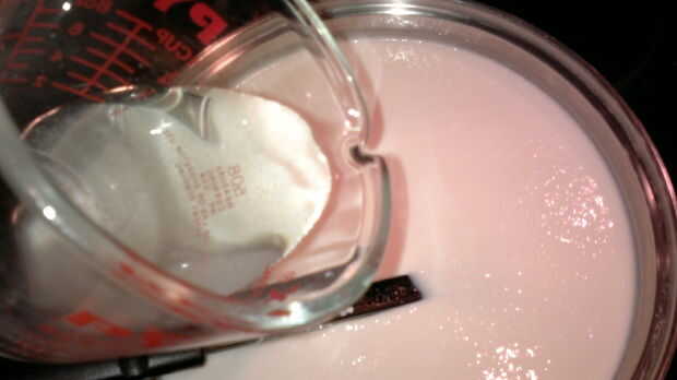 Añadir la solución de cuajo y mezclar bien. Es aceptable si la leche es un poco clumpy o granulada.