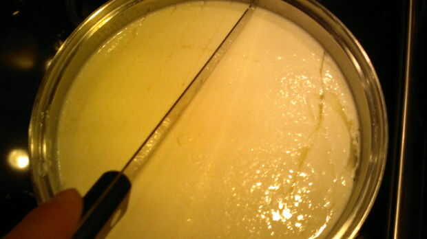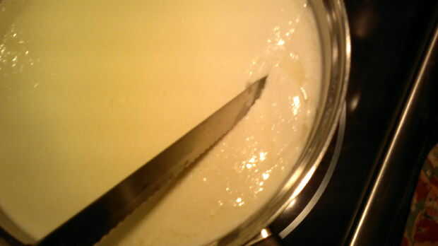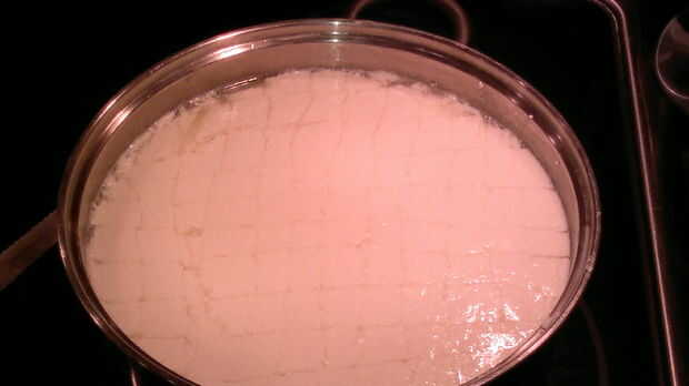 Mantenga el cuchillo en un ángulo de más de 45 grados y menos de 90 grados a la superficie de la leche. Cortar una rejilla de 1/2 pulgada, tan vertical como sea posible, en la cuajada. Han creado muchos prismas verticales square-ish. Si usted quiere, usted ahora puede desandar esas líneas con el cuchillo inclinado 45 grados al lado, para que esos prismas son cortados en piezas diagonalmente. No tienes que hacer esto, sin embargo, porque la cuajada será inevitablemente se quiebran para arriba en el paso siguiente de todos modos.