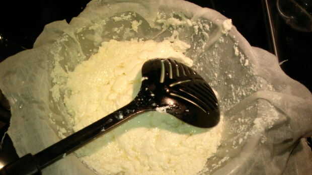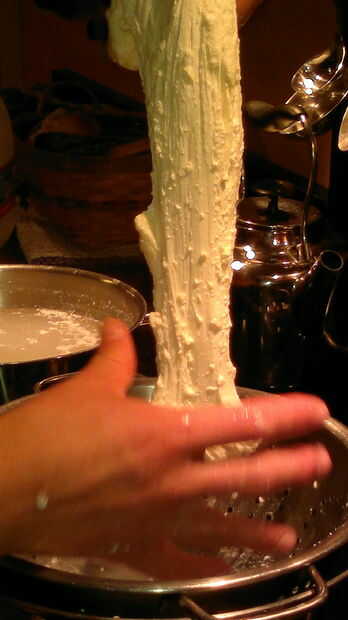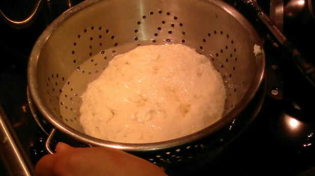 Acercar el colador y el recipiente a la estufa, donde han preparado el agua F 185. Después de pelar lejos la estopilla, dunk el queso en el colador, en el agua. Si sumergen antes de retirar la estopilla, probablemente nunca te la estopilla limpio otra vez. Necesita obtener la cuajada a 135 F, por lo que se estiran correctamente. Si lo prefiere que usted puede pone los guantes de goma amarillos para protegerse de la agua caliente. Prefiero a toma como un hombre y usar mis manos.
