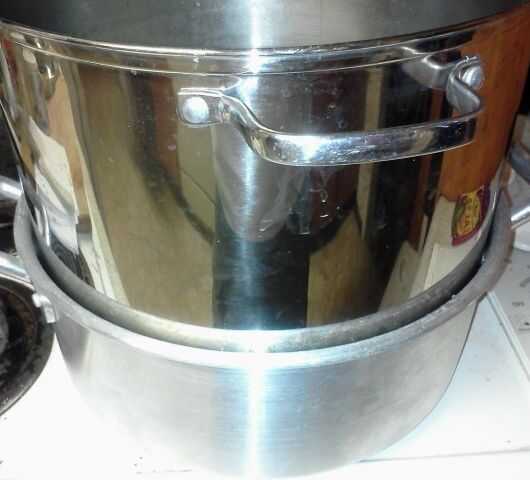 Usted no quiere poner leche directamente sobre el calor, una caldera doble es necesaria para prevenir quemaduras. Tu pote también debe ser lo suficientemente grande para 2 galones de leche.