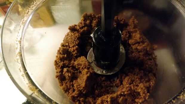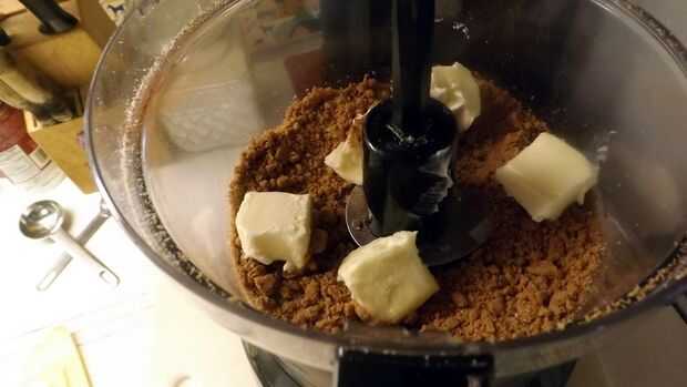 - Agregar las 6 cucharadas de mantequilla reblandecida y mezclar (pulso) hasta que quede una mezcla bien combinada de migajas húmedas (mezcla hasta que usted puede "grupo" de la mezcla entre los dedos).