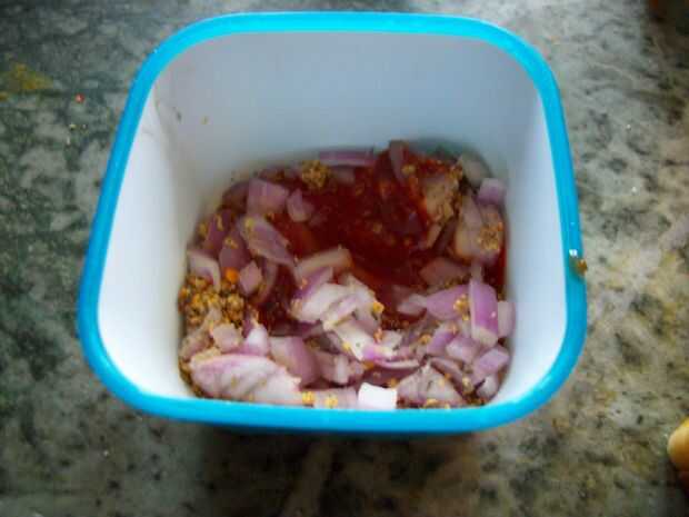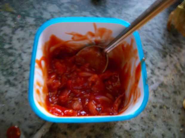 Tomar el recipiente y poner la salsa de tomate en él. Agregue el condimento de zza (Pi) y se mezclan un poco. Luego agregar las cebollas a la taza y mezclar bien. La salsa se parece al anterior. Puede ser diferente si usted decide añadir algo más.