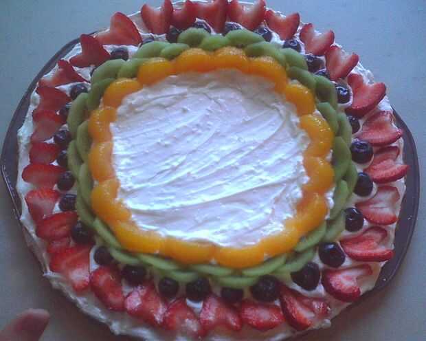 Yo quería hacer una torta simple con ingredientes accesibles, que deliciosa y hermosa. Se trata de simple pastel relleno con pastel de queso relleno y decorado con bouquet de fruta fresca. Está dedicado a mi abuela, Emma.Ingredientes:PastelDe harina