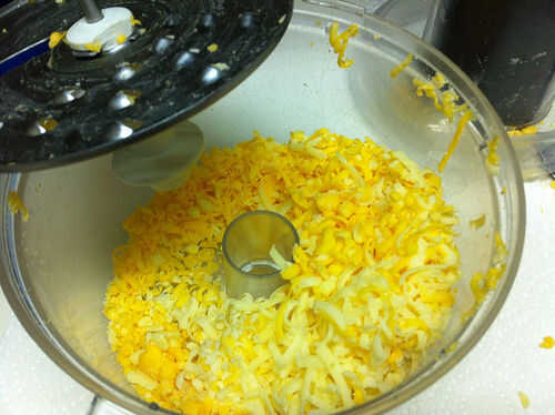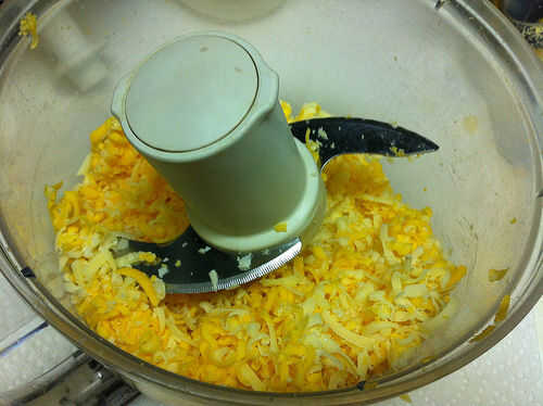 Ralle el queso si no lo has hecho ya. Poner en el procesador de alimentos con la hoja. Encendido, luego agregar el líquido, un poco a la vez. Quesos más agudos, más años de edad no tienen tantos emulsionantes. Tuve que usar algunos chedder medio regular con el cheddar de Dubliner que Josh le gusta en esta materia, o podría haber resultó demasiado granulada. Quesos más jóvenes no siempre tienen la profundidad de sabor que hacen los mayores, por lo que es bueno utilizar una mezcla.