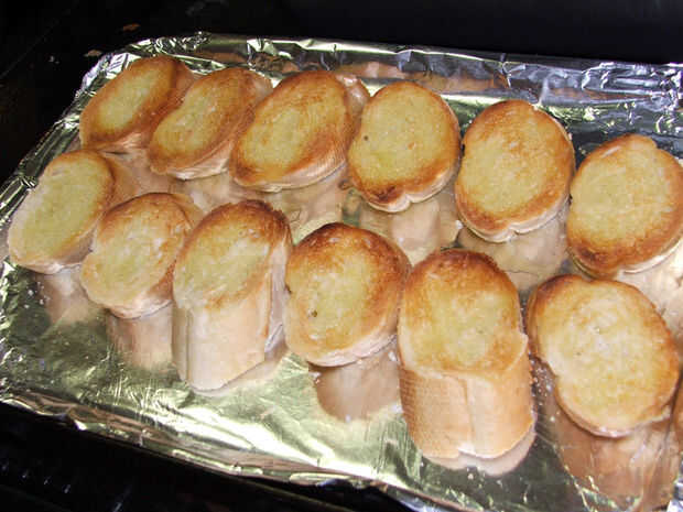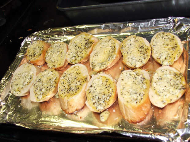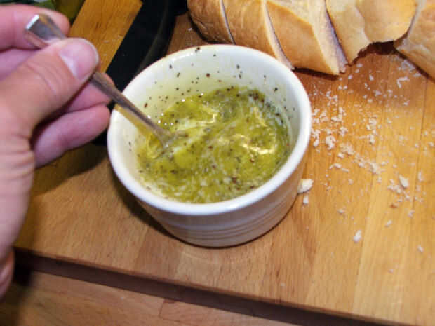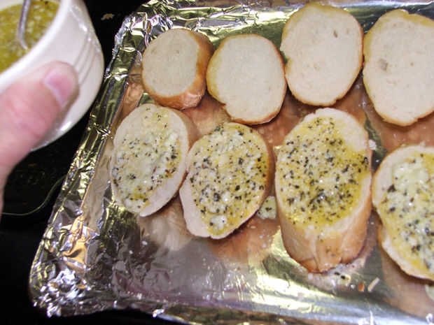 Añadir una buena cucharadita de la mezcla de mantequilla ajo a cada rebanada, revuelva la mezcla, así como el ajo tiende a hundirse hasta el fondo.