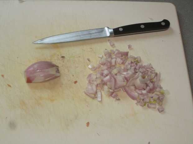 Al final de la última hornada añadir la chalota picada. Cuando las chalotas suaves, añado los primeros lotes a la última y sazonar al gusto con sal y pimienta. No olvidemos, sin embargo, que el tocino y el queso poner sal al plato así.