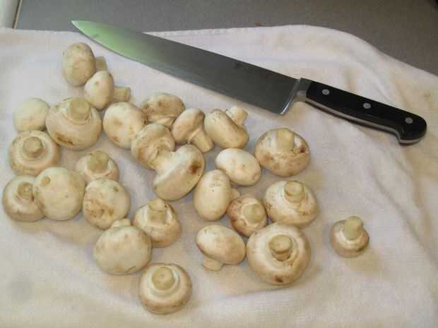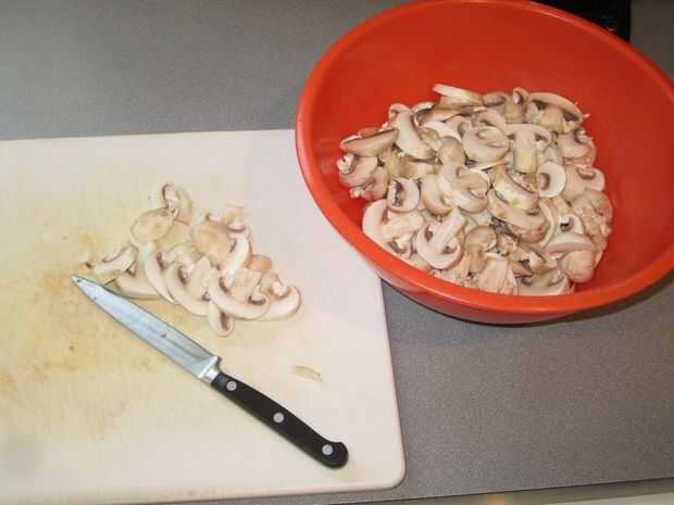Después de secar en un paño de cocina limpio, rebane los champiñones en +-1/4 rebanadas.