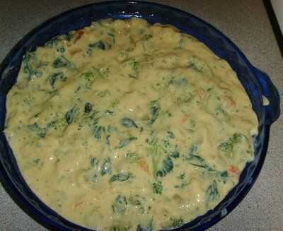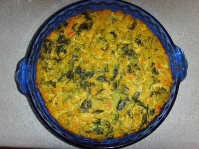 En una sartén con un poco de aceite, cocer las verduras, excepto las espinacas. Si usted no quiere añadir grasa extra, a cocer con 3 cucharadas de agua, que es lo que hice. Cuando las verduras estén cocidas añadir las espinacas y mezclar bien. Después de que han incorporado la Quiche de relleno que se preparó antes y las verduras en un tazón, vierta sobre la costra de arroz.