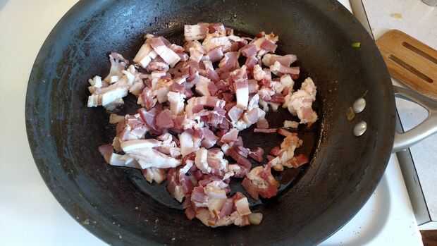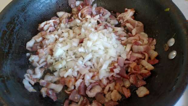 Saltear una taza de tocino a fuego medio hasta que apenas empiece a dorarse. Agregue las cebollas y cocine hasta que las cebollas son claras y el tocino esté crujiente.